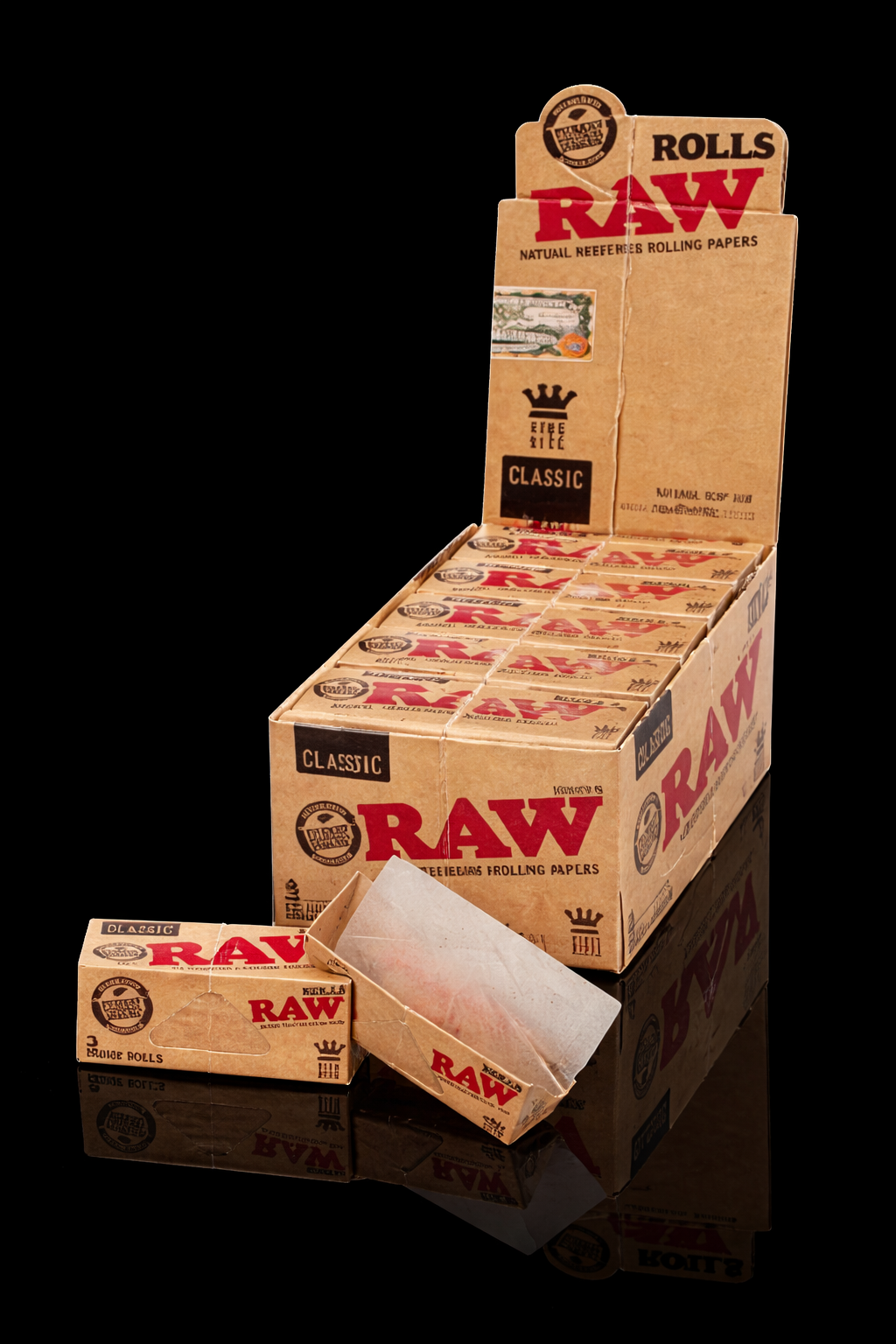 Rouleaux RAW® – papier à cigarettes en une seule pièce – fabriqué à partir de fibres naturelles biologiques, non traitées et non blanchies.