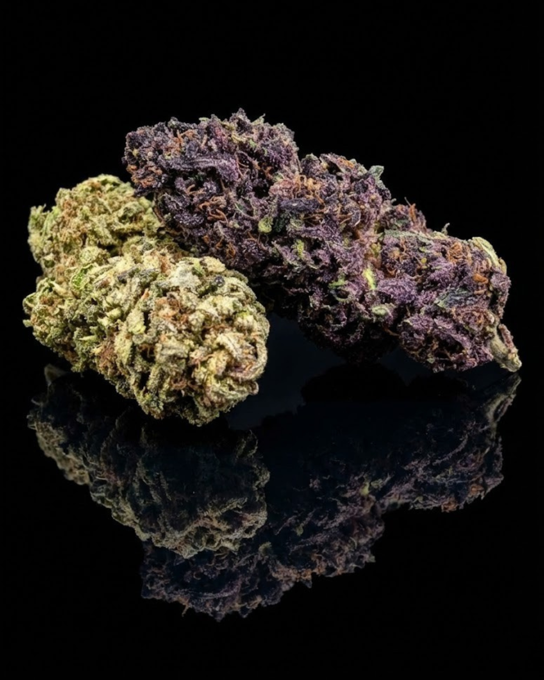 Mix de Phénotypes : Une esthétique variée mélangeant des buds verts et purples pour le plaisir des yeux.