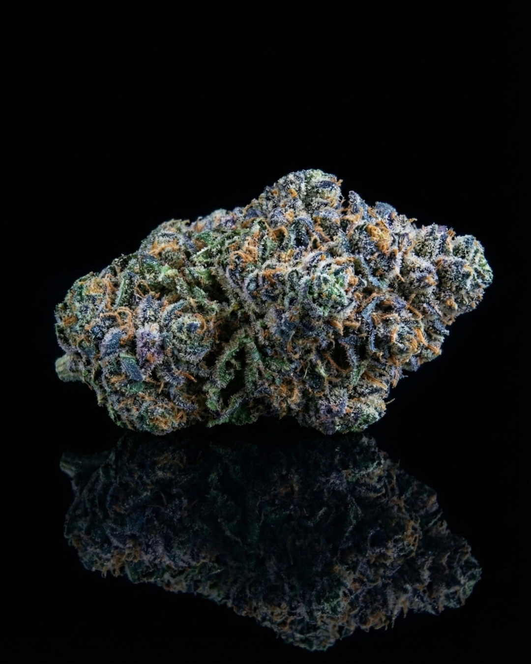 Visuellement, c’est une anomalie chromatique : des fleurs compactes, presque rocheuses, traversées de nuances bleu nuit et violettes, saturées d’une résine qui scintille comme des pixels morts.