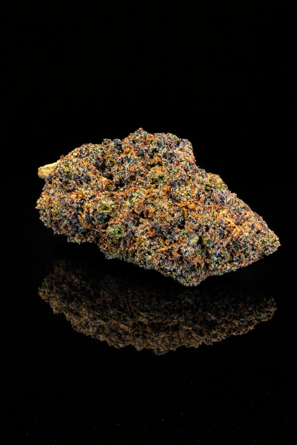 Ses fleurs sont une explosion de couleurs, allant du vert forêt au violet sombre, presque noir, le tout saupoudré d’une résine cristalline qui capte la lumière. Au nez, c’est un voyage immédiat vers la gourmandise : un bouquet dominé par le sucre, presque confit, relevé par une pointe de fraîcheur printanière. Une légère note terreuse vient équilibrer l’ensemble en fin de nez, ancrant la fleur dans son authenticité.