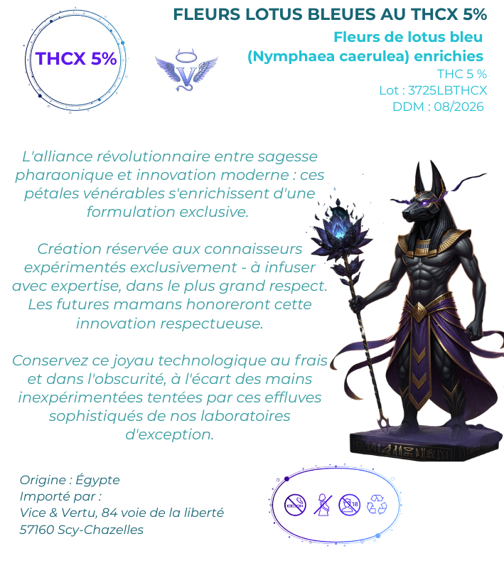 Fleur mythique du Nil, symbole d’éveil spirituel et de pureté intemporelle.Le Lotus Bleu THC-X 5% unit tradition pharaonique et biotechnologie moderne.Infusion sacrée – expérience de sérénité augmentée.