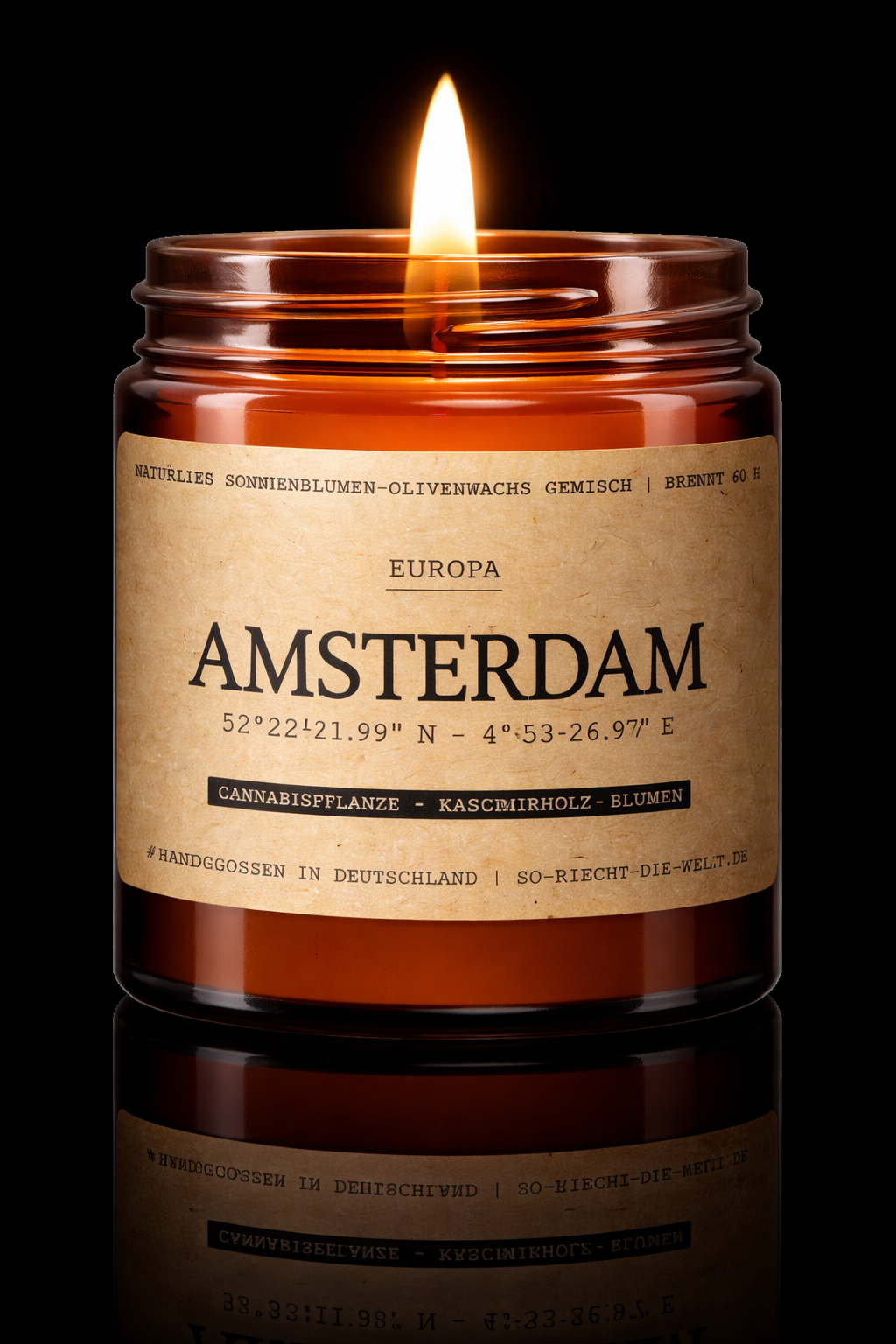 « C’est l’odeur dynamique d’Amsterdam. Une ville pas très grande mais incroyablement internationale, célèbre pour ses plus beaux ponts, ses canaux et ses péniches emblématiques. Son ambiance jeune et créative la rend unique, et pour beaucoup, le cannabis en est l’un des symboles forts. C’est pourquoi nous l’avons incorporé subtilement dans notre parfum élégant Amsterdam. Cette bougie moulée à la main en Allemagne propose une alliance sophistiquée de notes de bois de cachemire, de touches florales fraîches et, bien sûr, d’un soupçon subtil de la plante de cannabis. Grâce au mélange naturel de cire de tournesol et d’olive, cette bougie crée rapidement une atmosphère florale, fraîche et dynamique dans votre maison, qui dure longtemps avec environ 60 heures de combustion. C’est le compromis parfait entre fraîcheur végétale et élégance urbaine. »