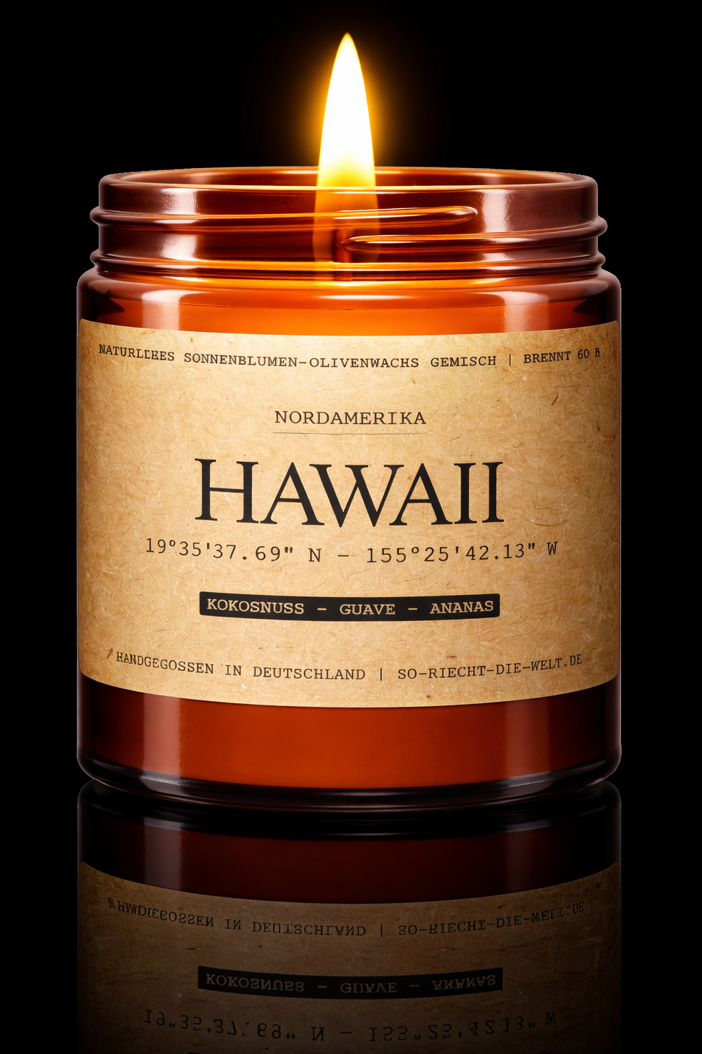 « Plongez au cœur d’un rêve : voici l’odeur de Hawaii. Cette bougie incarne une île aussi belle que le paradis lui-même, où les danseuses de hula partagent leur histoire avec une nature à couper le souffle. Les senteurs exotiques de ces îles, qui puisent leur inspiration dans la richesse de la flore locale, ont été capturées dans cette merveilleuse composition aromatique. Votre intérieur sera instantanément envahi par des arômes onctueux de noix de coco crémeuse, de goyave sucrée et d’ananas juteux, rehaussés par des notes de tête rafraîchissantes de melon et de pamplemousse. Ces effluves évoquent le mode de vie Aloha, enchanteur et décontracté, directement chez vous. Combinée à notre mélange naturel de cire de tournesol et d’olive, cette bougie coulée à la main en Allemagne vous promet environ 60 heures de combustion pour profiter longtemps de ce rêve insulaire. »