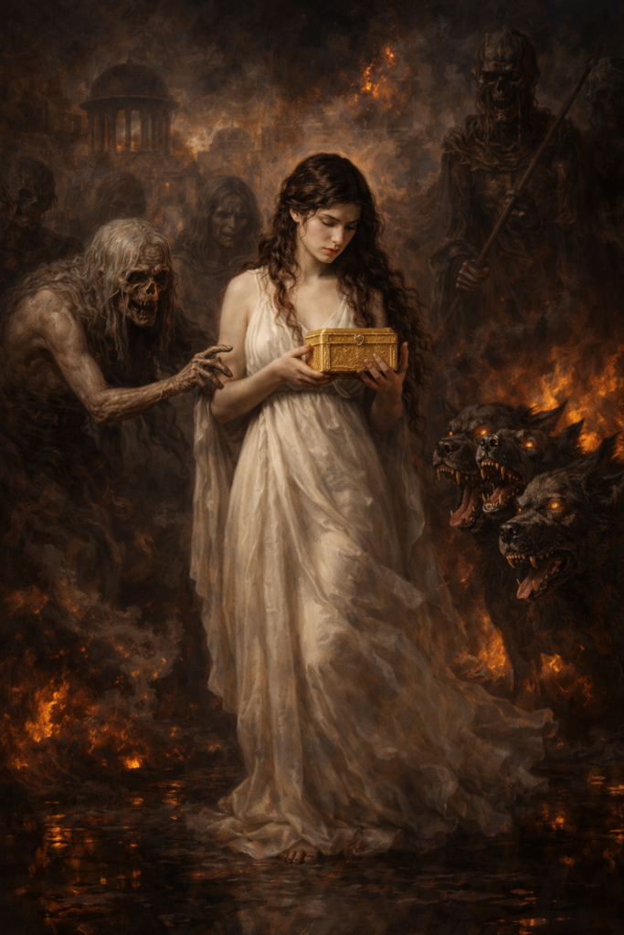 Son épreuve finale est un véritable bras de fer entre elle est Aphrodite. La déesse de la Beauté lui ordonne de descendre aux enfer pour y récolter un morceau de la beauté de Perséphone. Cette dernière déesse des Enfers et également la Déesse du Printemps est du renouveau.