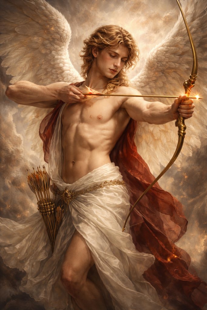 D’un geste il décoche une flèche d’or pour réveiller la passion, l’admiration. Mais gare à vous si vous êtes transpercés d’une flèche de plomb, car Éros révèlera alors le dégout.